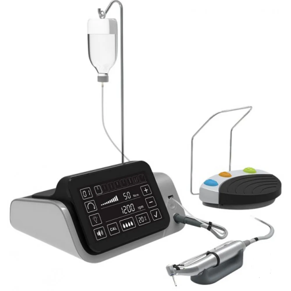 Хирургический аппарат с большим и контрастным сенсорным дисплеем. Интуитивно понятное меню обеспечит легкое и быстрое управление устройством Аппарат оснащен легким бесщеточным микромотором и хирургическим наконечником (20:1) с фиброоптикой Новая легкая педаль оснащена кнопками для управления ирригацией, выбора программы и переключения направления вращения. Педаль оборудована скобой для удобства переноса ногой. Ирригация • Ножное и ручное управление • Наружное и внутреннее охлаждение • Тихая и мощная водная помпа • 5 режимов подачи физ. раствора от 50 до 135 мл/мин Управление • Большой сенсорный LED экран • 7 вариантов передачи для угловых наконечников • 8 настраиваемых программ (скорость, крутящий момент, подача физ. раствора, реверс) |