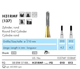 Максимальная скорость - 160 000 об/мин Рекомендуемая скорость - 60 000 об/мин H31RMF - ISO 500 314 137 008 010 (диаметр 010) - снятие коронок H245MF - ISO 500 314 234 008 008 (диаметр 008) - удаление старых реставраций |