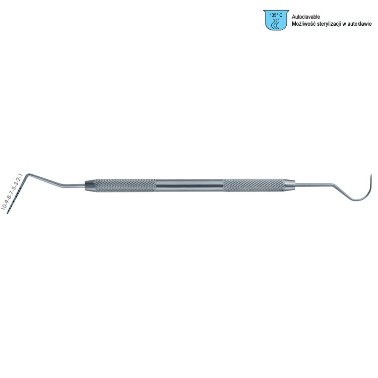 Изготовлен из нержавеющей стали Двухсторонний С одной стороны рабочая часть серповидная, с другой стороны - изогнута под углом 120 градусов и градуирована на 1 - 2 - 3 - 5 - 7 - 8 - 9 -10 Остроконечный |
