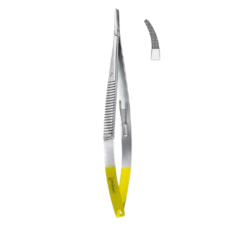 Изготовлен из высококачественной нержавеющей стали Изогнутый Длина 140 мм Рабочие поверхности выполнены из карбида вольфрама, с насечками Micro 0.2 Предназначен для шовного материала размеров от 6/0 до 10/0 |