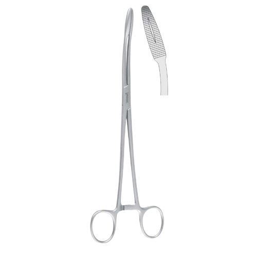 Изогнутый корнцааанг Длина 200 мм Изготовлен из нержавеющей стали Рабочие части овальной формы, внутренние поверхности имеют поперечные насечки |