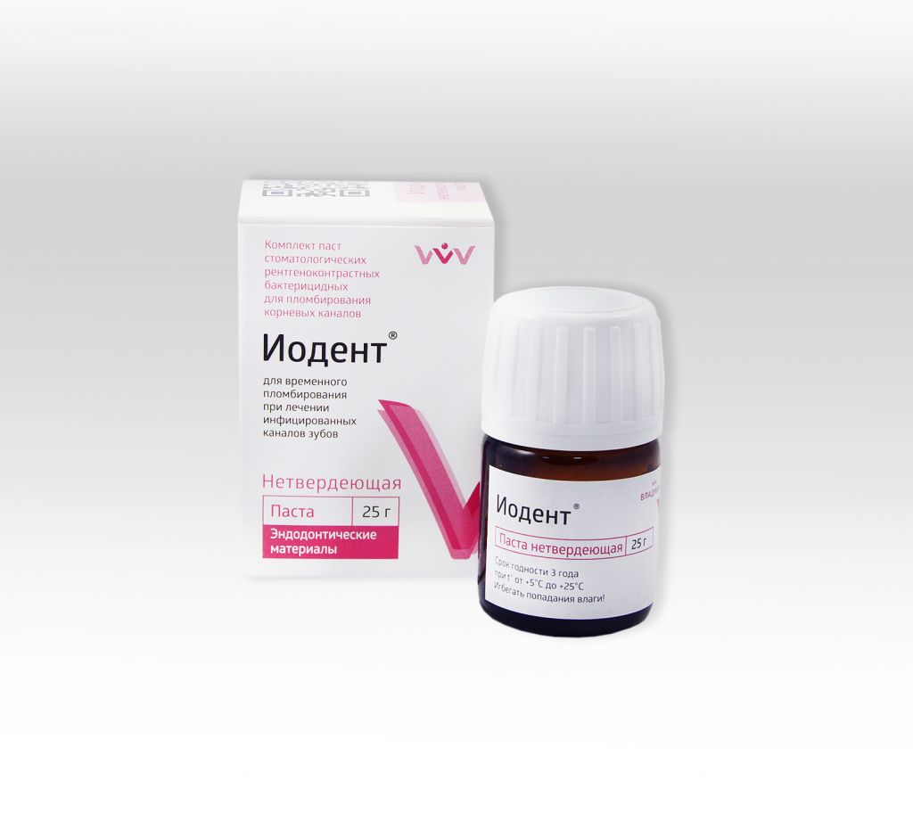 Пасты «Иодент» обладают пролонгированным дезинфицирующим и бактерицидным действием, содержат: хлорфенол, антисептик ряда фенола, камфору, смягчающую воздействие фенолов на организм, иодоформ, обеспечивающий длительное антимикробное воздействие материала в канале, пастообразователь гидрофобного характера, наполнитель, стимулирующий образование костных остеобластов на уровне апекса, а также обеспечивающий рентгеноконтрастность материала |