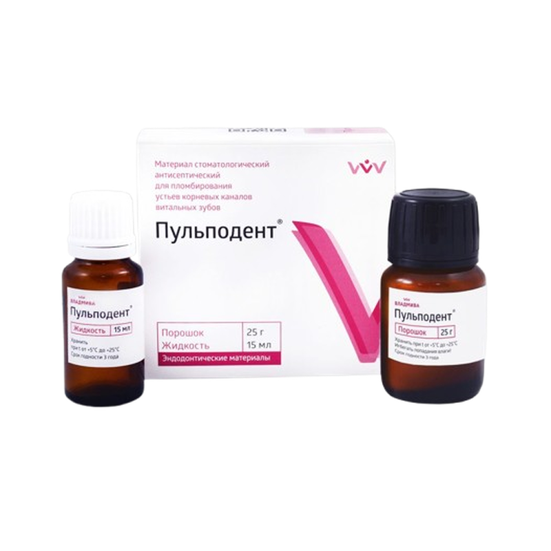 Пульподент выпускается в виде порошка и жидкости. В состав порошка входят: полиоксиметилен - антисептик, коагулирующий альбумины, обеспечивая частичную девитализацию пульпы. иодоформ, обеспечивающий непрерывное антибактериальное действие. окись цинка и рентгеноконтрастная добавка. Жидкость содержит: эвгенол, обладающий анальгезирующим, антисептическим и успокаивающим свойствами. формальдегид – антисептик, обладающий микробоцидной, микробостатической активностью и универсальным спектром действия как высоко реакционноактивный стерилизующий агент. фенол – антисептик, обладающий бактерицидными, бактериостатическими, мумифицирующими свойствами, а также обеспечивающий стерилизацию остаточной пульпы зубов (в частности, при лечении инфицированных временных моляров методом пульпотомии, как единственное исключение из правила пульпотомии на витальных зубах). дексаметазон (0,13%) - активный глюкокортикостероид, содержащий фтор и оказывающий эффективное противовоспалительное и антиаллергическое действие, снижающий болевые реакции после пломбирования. |