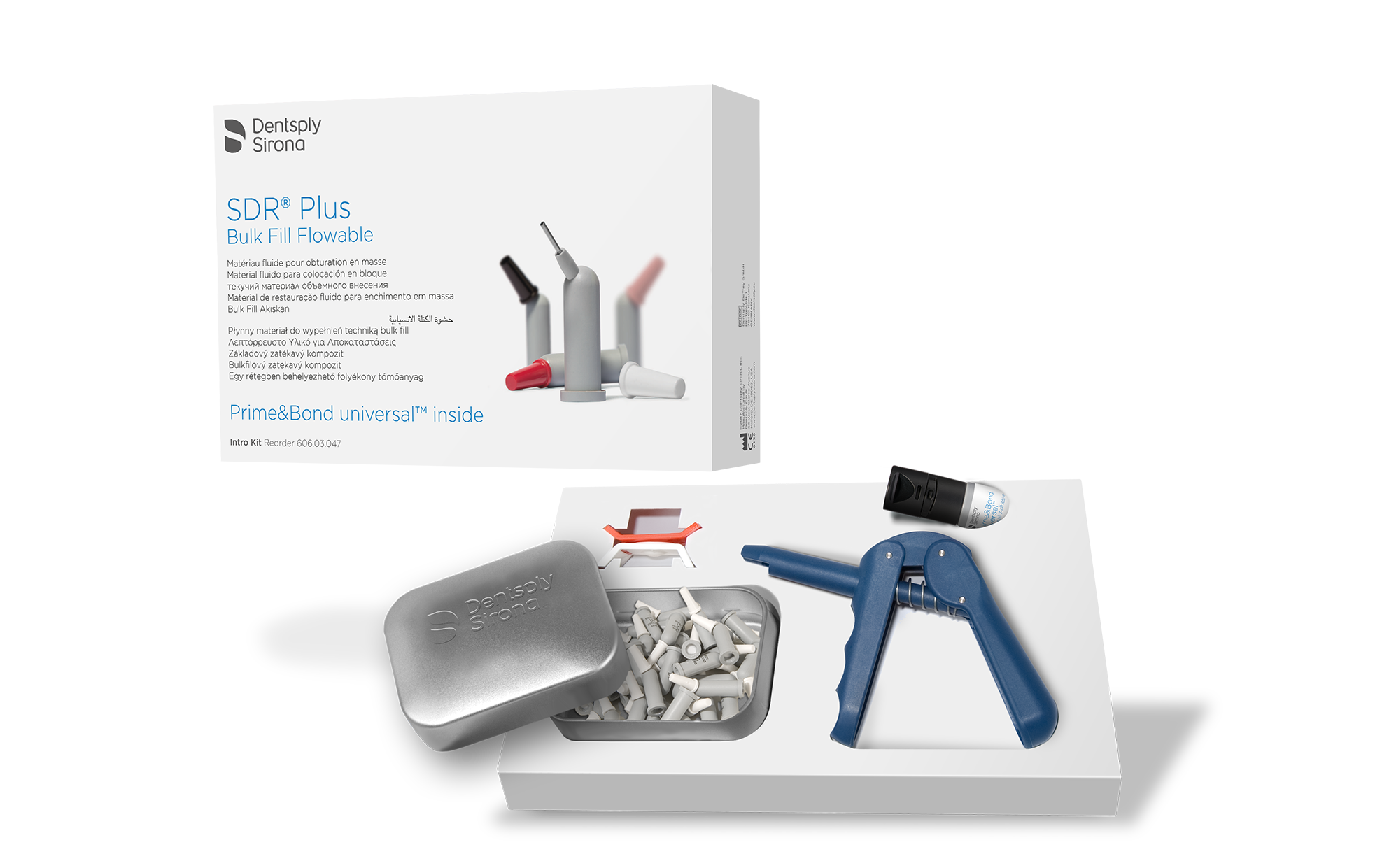 Набор (каталожный номер № 606.03.047): SDR® Plus в компьюлах по 0.25 г универсального оттенка 45 шт. коробка для хранения компьюл 1 шт. адгезив Prime&Bond® universal во флаконе 2.5 мл – 1 шт., палетка пластиковая для смешивания CliXdish (1 шт.). пистолет для компьюл 1 шт |
