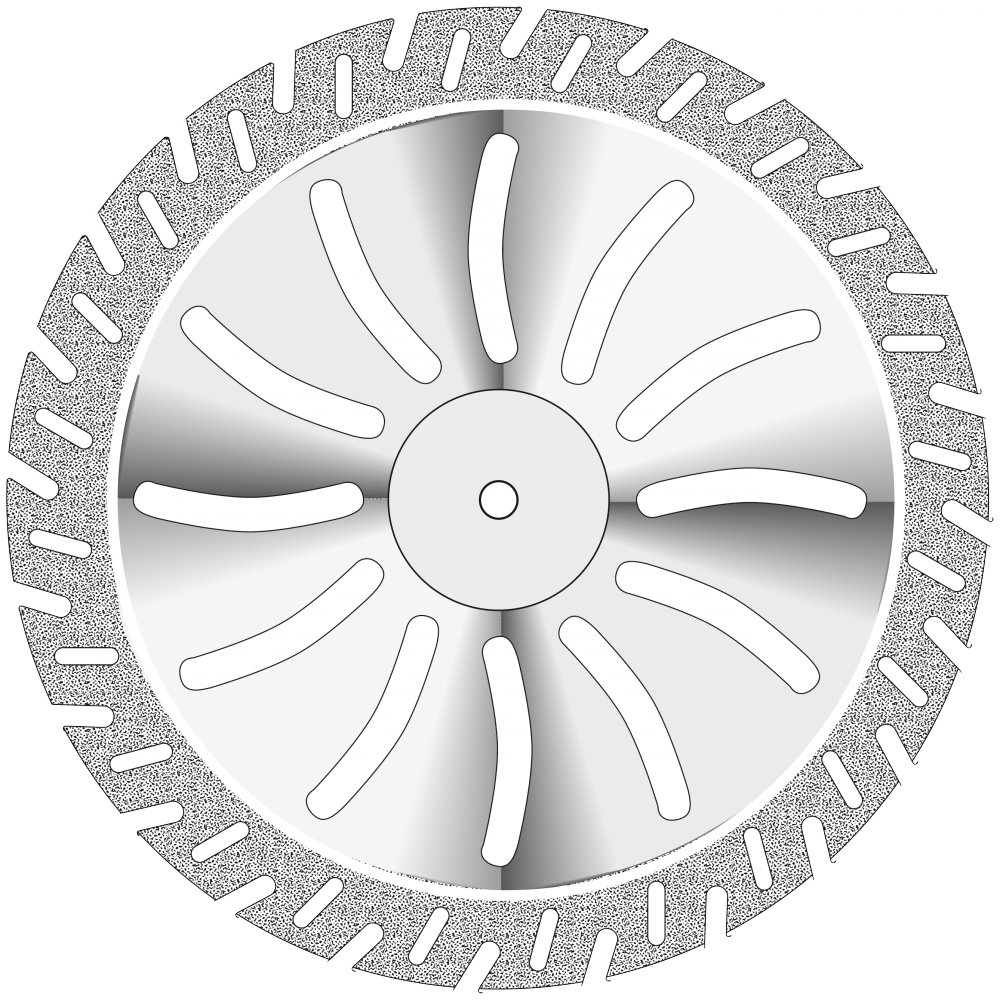 Конструкция дисков с пазами и отверстиями разных конфигураций позволяет: эффективно удалять продукты резания из зоны обработки, значительно улучшать обзор и охлаждение обрабатываемой поверхности создавать тонкие межзубные щели с высокой точностью сепарировать не только керамику, но и металл, детали небольшой толщины. |